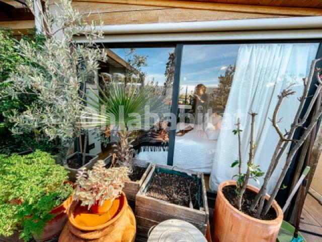 Un espacio lleno de luz natural, con dos habitaciones, dos baños y una cocina abierta que respira hacia el salón y la terraza. Una terraza de madera que invita a las largas tardes de verano, con zona chill out, piscina privada y rincones verdes llenos de vida.