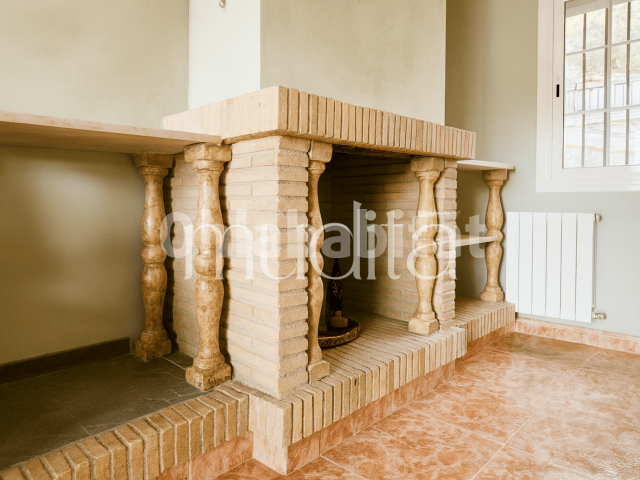 En la planta principal, el salón-comedor se abre como un mirador cálido. La chimenea invita a tardes lentas, mientras la terraza deja ver las montañas del Maresme enmarcadas como un cuadro. La cocina, práctica y generosa, recupera la esencia de cocinar para otros: el pan del domingo, las conversaciones largas, la familia en torno a la mesa.
